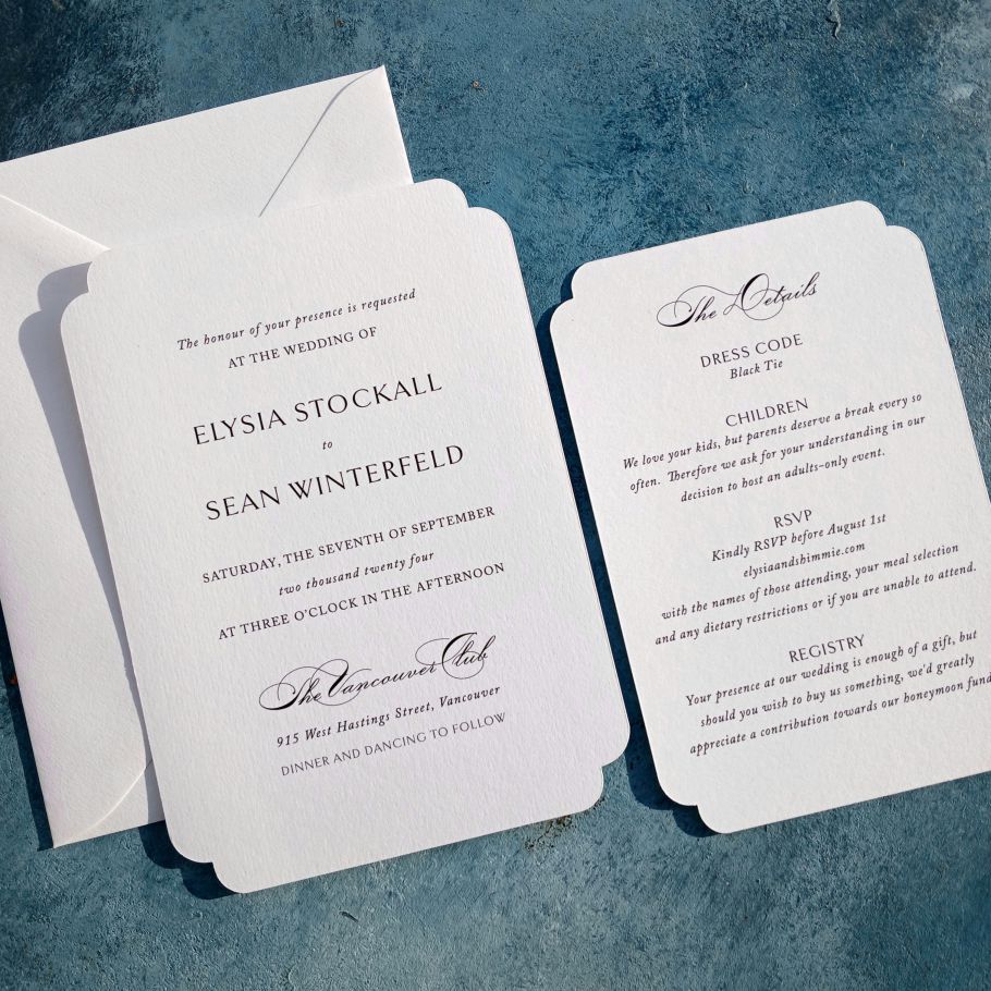 I am currently working on new website that will have price guides for all the designs along with quote requests for your own personalization. With so many design styles, papers and print methods to choose from, a custom quote for your preferences is best. Until then, this guide is to show you the basic starting points to help with budget decisions. I’m always happy to take calls as well for any questions you may have – customizations, colour availability, day of stationery needs – 604-517-1700 Tonya.