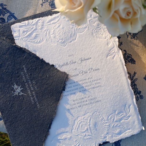 - Invitation 5×7 inches on 250 g handmade paper with natural deckle edge, letterpress printed and blind deboss ‘stock’ pattern. (For a custom pattern to be created a quote would have to done based on requirements.)