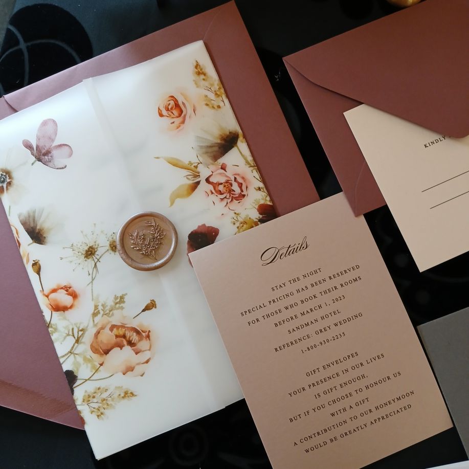 - Vellum wrap printed and sealed with stock design wax seal – assembled (no assembly required by you)
