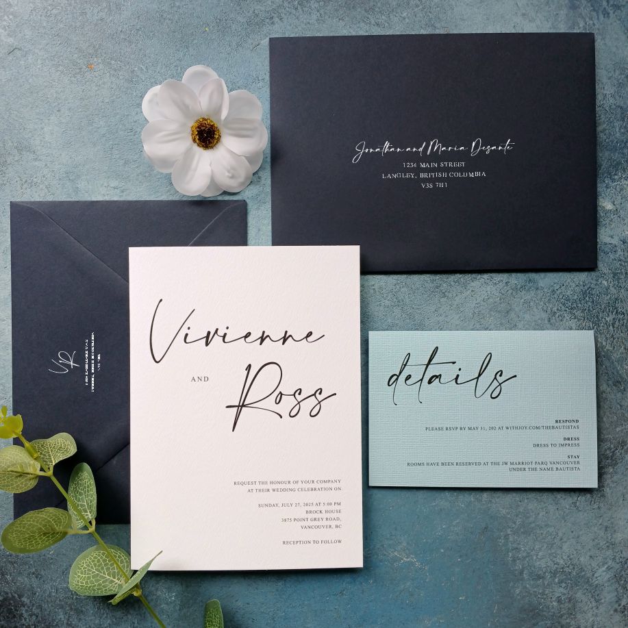- Envelope printed with both your return address and the guest’s address, in this case – white ink on navy blue envelope